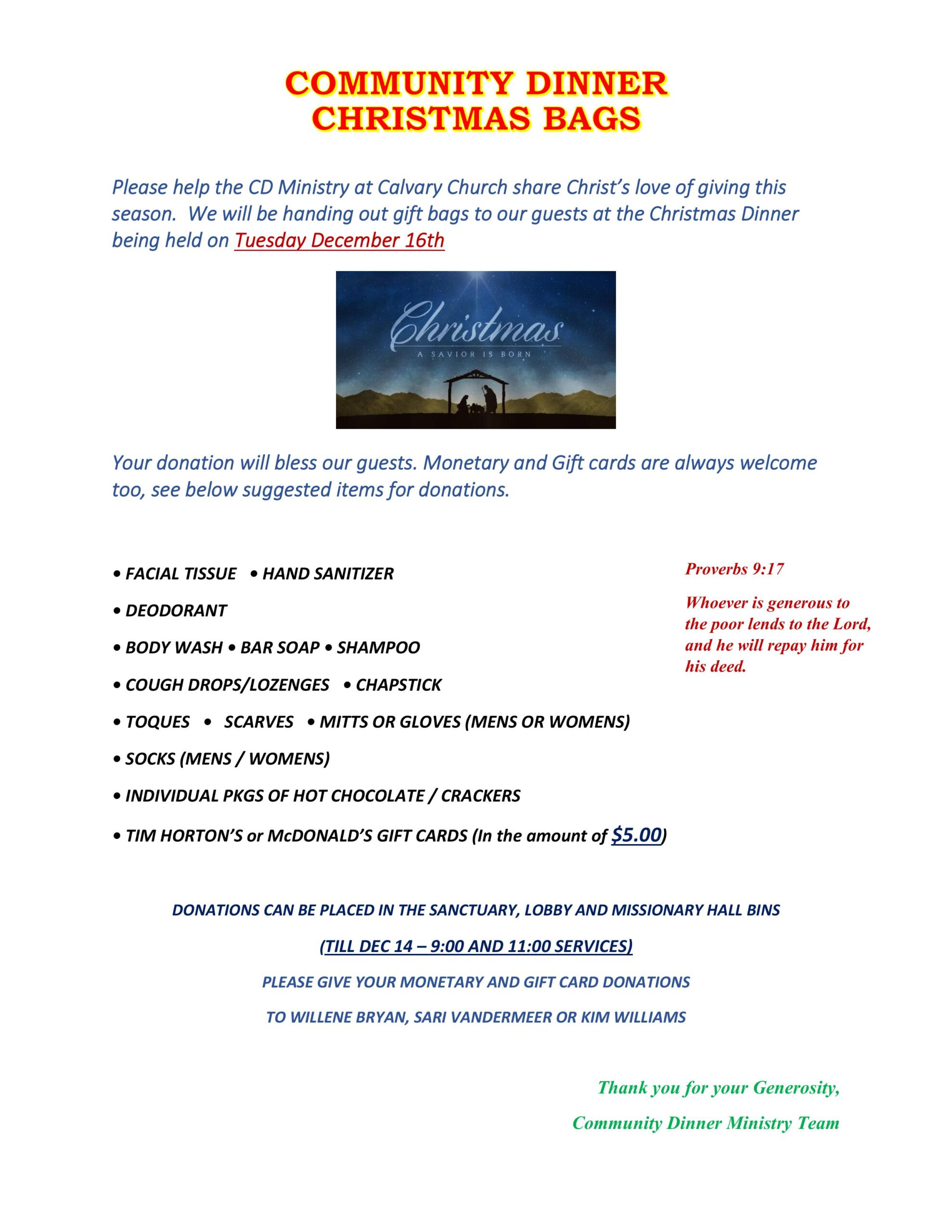 The Community Dinner provides hot, nutritious meals to all who are in need of one during the winter months of November to March. Dinner is served every Tuesday evening at 6:00 pm during those months. Everyone is welcome to attend. Dinners take place in Missionary Hall. Our group of fully trained and screened volunteers prepare and serve the food.